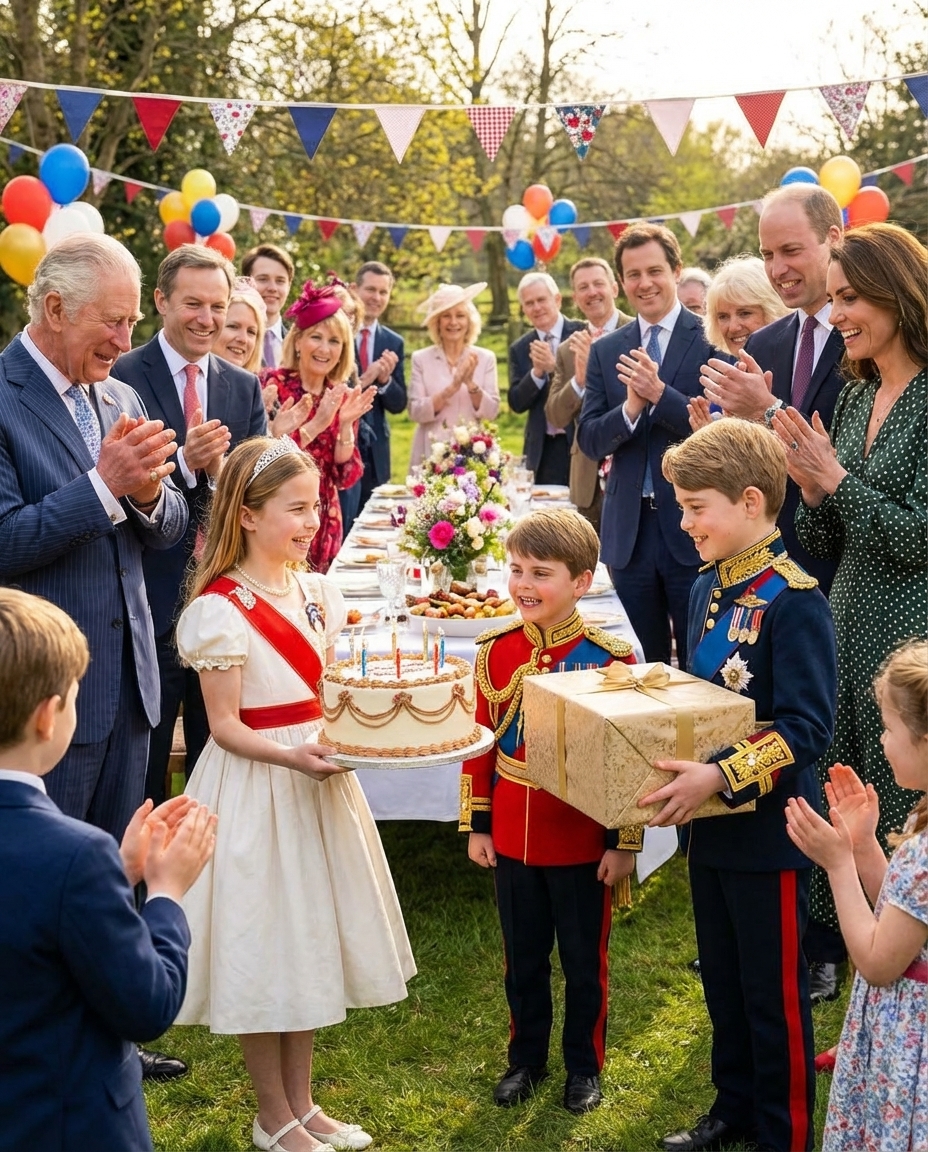 As the clock struck midnight, the family gathered in the garden, hidden behind trees and bushes, eagerly awaiting Louis’s arrival. When he finally stepped into the garden, shouts of “Surprise!” rang out. The cheers echoed around him, and his face lit up with joy. Princess Charlotte, holding an elaborately decorated birthday cake with candles, and Prince George, clutching a gift box wrapped in brightly colored paper, approached their brother with beaming smiles. It was a moment that encapsulated the essence of childhood joy and family love.