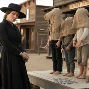 A lonely widow bought three orphans with sacks on their heads and took them away when one of them… Martha Langley had no reason to stop in the village that day. She didn’t need bread, or nails, or anything else to justify the detour. But the wind changed, and something in that change, more a feeling than an idea, made her pull the horse toward the square. Then she saw three children standing like statues, with sacks tied over their heads and their hands tied behind their backs. At their feet, a hand-painted sign read: “Orphans!” For each one, “No name, no age.” Martha got out of the cart without a word. Her boots hit the ground with the firmness of someone who doesn’t ask permission. At first, no one noticed her. She was the silent widow who came and went without greeting anyone. But this time she walked straight into the crowd, and something in her eyes made everyone turn around. The auctioneer, a red-faced man wearing short suspenders, coughed uncomfortably. “Ma’am, are you here for one?” She didn’t answer. She just leaned closer. The oldest of the three children, perhaps 11 or 12 years old, swayed slightly but held his ground.SEE MORE BELOW