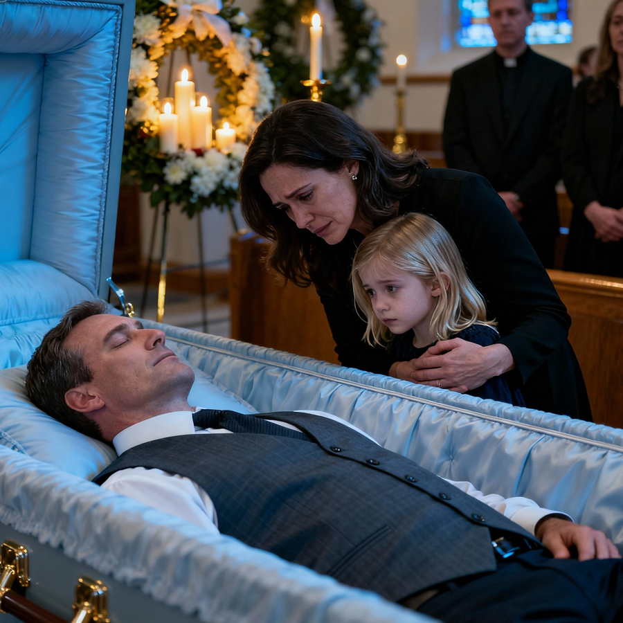 At the funeral of her father, the little girl whispered, “Dad’s not gone. He’s just taking a nap,” — and what followed left the entire room in utter disbelief….The chapel smelled faintly of lilies and rain-soaked earth. Rows of black umbrellas leaned against pews, dripping onto the polished floor. People spoke in murmurs, the kind reserved for grief and secrets. At the front, an oak coffin rested beneath a framed photograph of Daniel Mercer, 42, smiling under a bright Californian sun — a picture too alive for the room it now commanded.