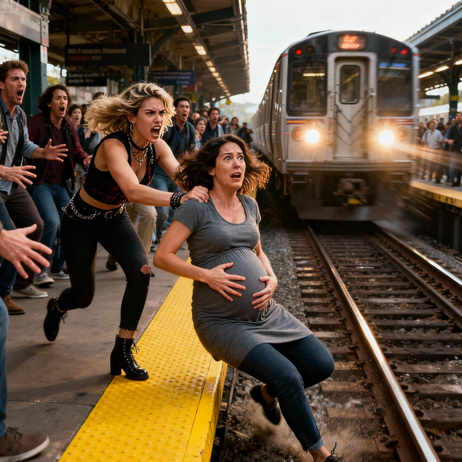 A man in a navy-and-gray conductor’s uniform sprinted along the gravel. He grabbed Emma under her arms and hauled her upward with a single, powerful motion. The train screeched as he yanked her toward the platform’s edge, the metal wheels blasting past only inches away. They collapsed against the concrete, both gasping, alive.