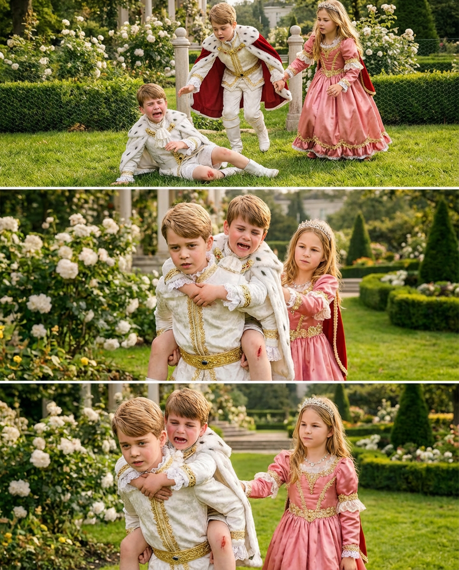 Without hesitation, George and Charlotte acted. George, displaying a maturity far beyond his years, gently helped Louis to his feet. “It’s alright, Louis. I’m here,” he reassured, his voice steady despite the worry etched on his face. Their sibling bond was evident as George offered his back to Louis, encouraging him to climb up.