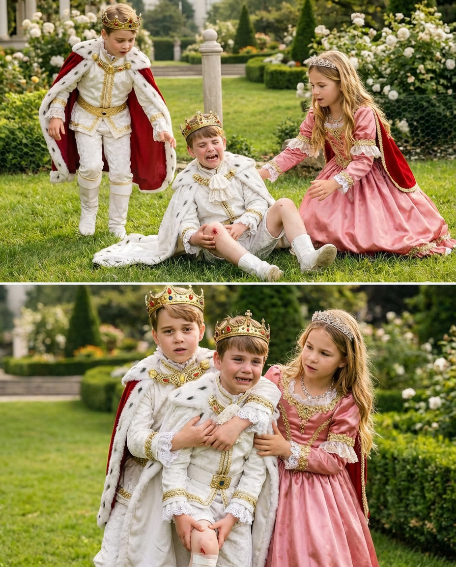 When Louis fell, the cheerful atmosphere changed. The little prince quickly felt pain, causing his leg to swell. The incident not only startled Louis but also worried George and Charlotte. In an instant, their playful demeanor transformed into urgency and care.