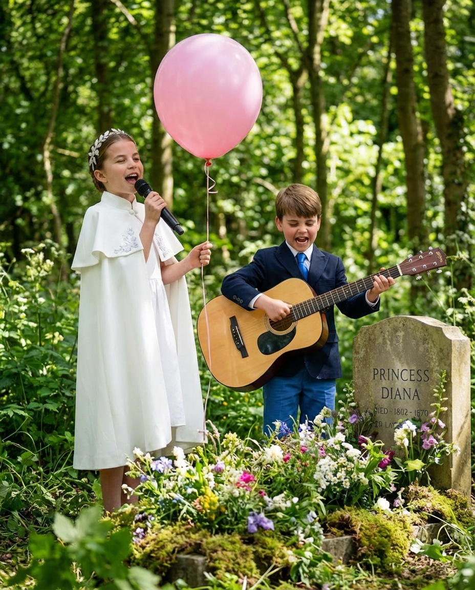 In a deeply moving gesture of love and remembrance, Princess Charlotte and Prince Louis recently visited the grave of their late grandmother, Princess Diana, nestled in the tranquil setting of Althorp Estate. The scene was not only a poignant tribute but also a beautiful moment capturing the innocence and joy of childhood. As Charlotte held a colorful balloon and sang “See You Again,” Louis enthusiastically played the guitar, creating a blend of nostalgia and joy that deeply impressed those present.