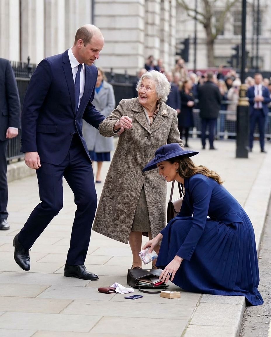 Without hesitation, Prince William stepped forward, instinctively reaching out to support the woman’s arm to help her regain her balance. His swift action demonstrated not only the readiness of a future king but also his genuine concern for those around him. Meanwhile, Princess Catherine knelt to help, picking up the scattered items and gently placing them back into the woman’s bag.