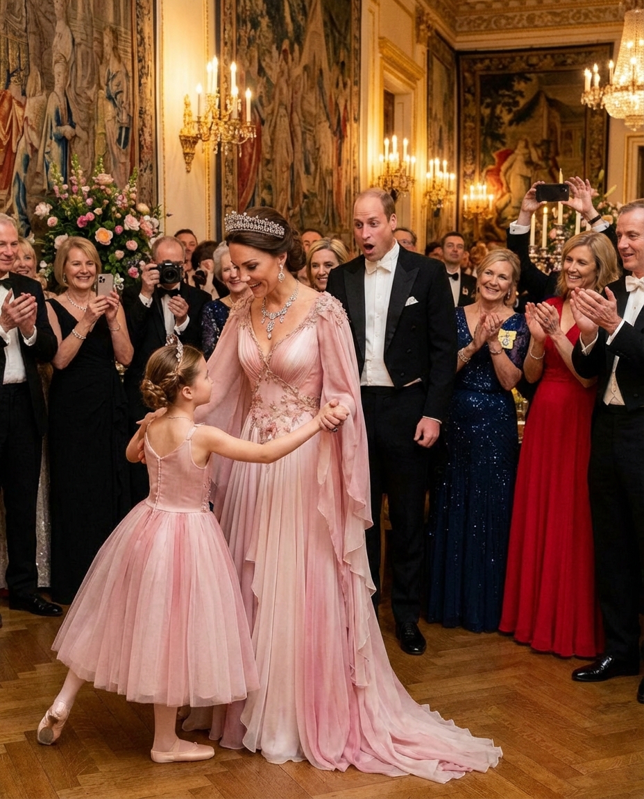 Princess Catherine, renowned for her composure and grace, took to the stage with her daughter, Princess Charlotte. Mother and daughter, resplendent in dazzling gowns under the palace lights, were poised to captivate the audience with a ballet performance reflecting both their passion for dance and their devotion to family tradition.