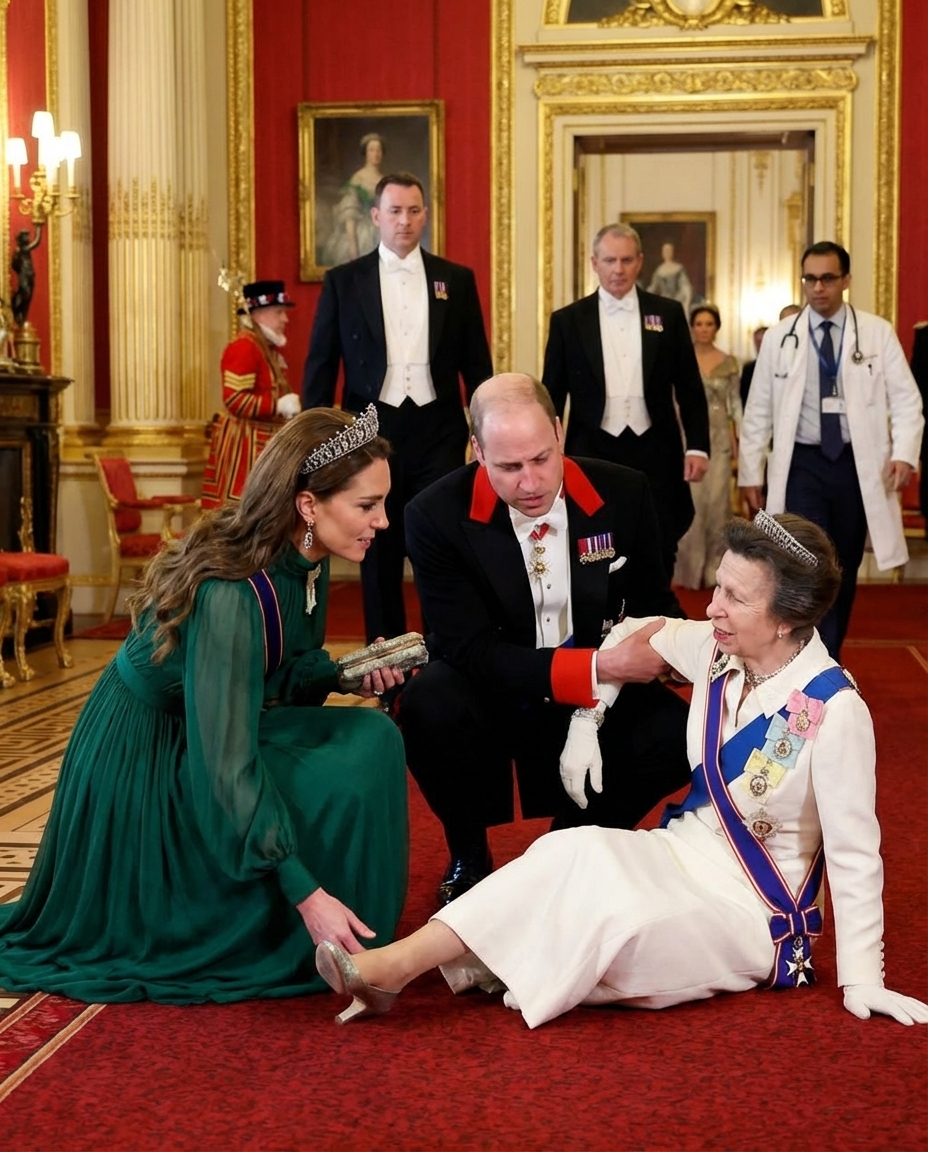 On the day of the ceremony, Princess Anne was performing her royal duties, demonstrating her dedication to public service. However, while moving through the palace grounds, she tripped and injured her leg. Witnesses reported that the atmosphere quickly shifted from cheerful to anxious as those around her rushed to her aid. Among them were Prince William and Catherine, who immediately bent down to help her up.