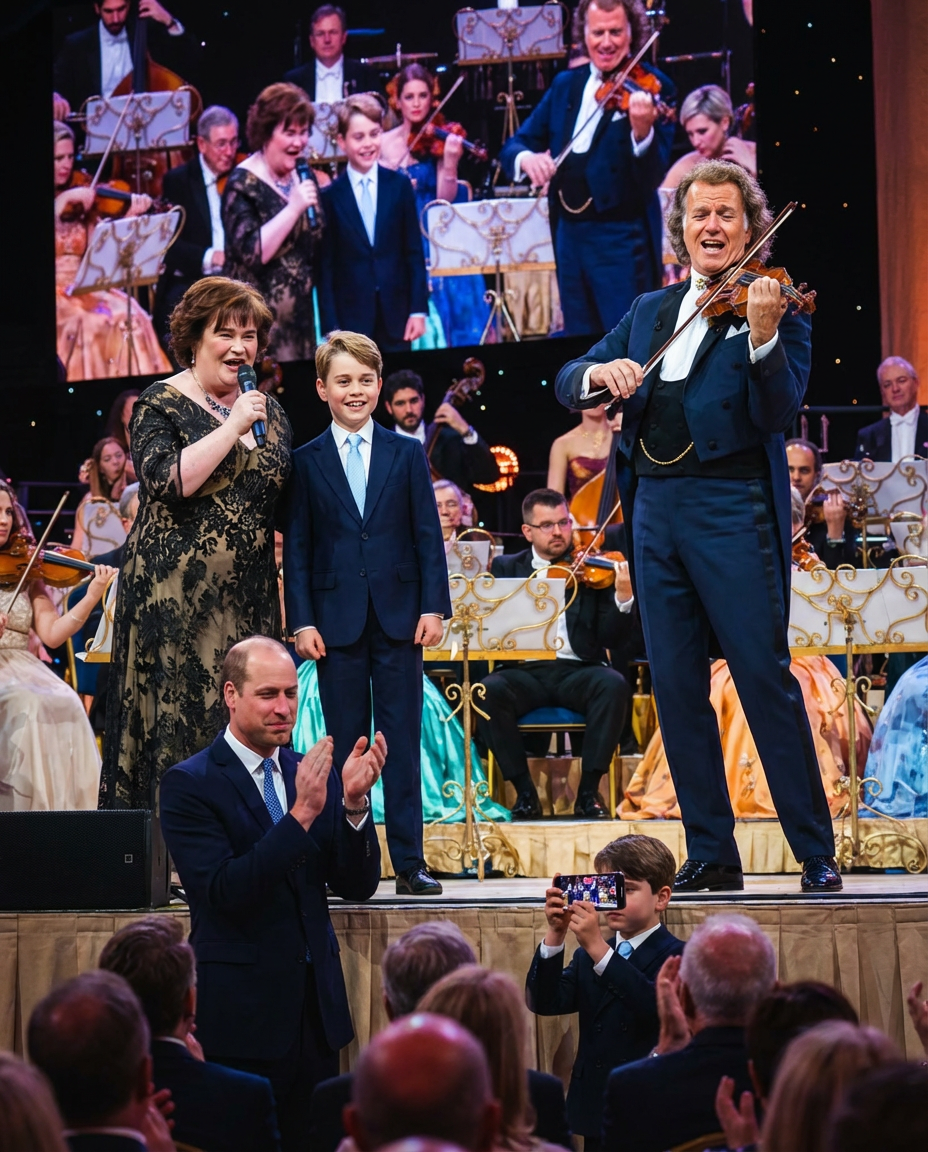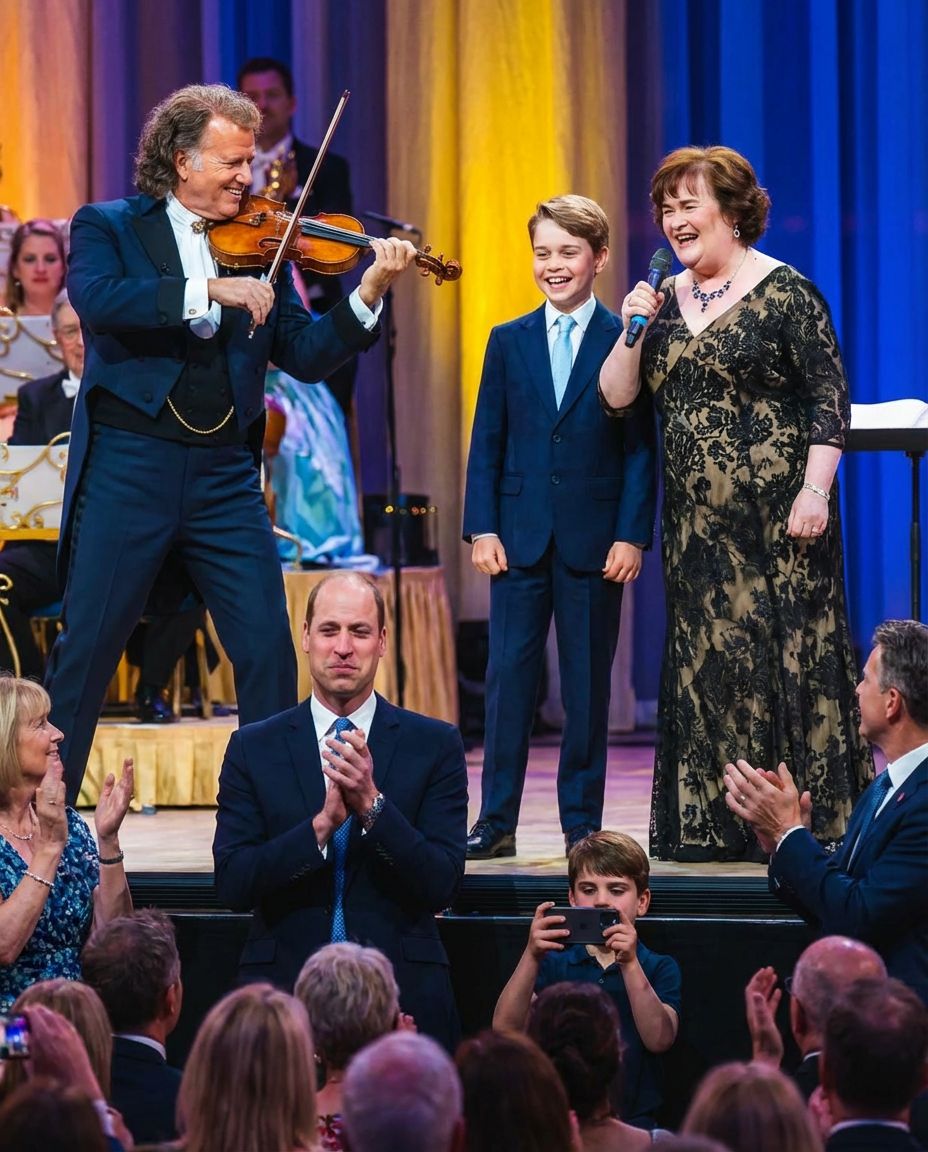 On a dazzling evening filled with music and emotion, a surprise performance unfolded, thrilling the attendees of the private musical gathering. Prince George, the eldest son of the Duke and Duchess of Cambridge, took the stage with two musical legends: renowned violinist André Rieu and beloved singer Susan Boyle. The trio performed a moving duet, showcasing not only George’s burgeoning talent but also touching the hearts of many, including his father, Prince William.
