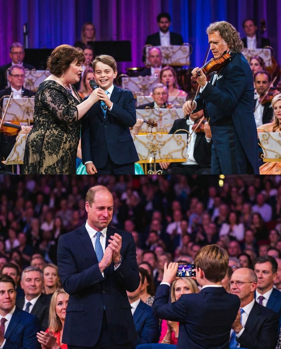 As night deepened, the audience enjoyed a series of performances by various artists. However, the highlight was when Prince George stepped onto the stage, microphone in hand, his radiant smile illuminating the entire hall. Accompanied by André Rieu’s violin and Susan Boyle’s powerful vocals, George began singing a song dedicated to his father, Prince William. This song choice held profound meaning, reflecting the close bond between father and son.