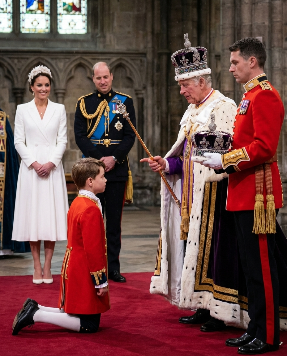 King Charles is renowned for his thoughtful gifts, but this one was particularly moving. As Prince George knelt before his grandfather, who held a royal scepter and pointed it at him, the moment was filled with emotion. Accompanied by a royal guard carrying the crown and royal robes, the scene was a vivid reminder of the weight of tradition and the expectations placed upon the young prince.