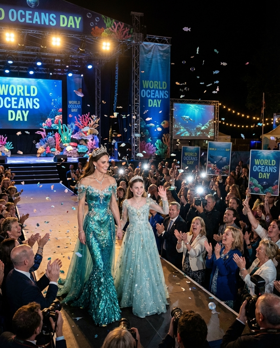 In a confident and decisive performance, Princess Catherine and her daughter, Princess Charlotte, were honored to attend the Ocean Festival as esteemed ambassadors. The event, aimed at raising awareness of ocean conservation and the importance of marine ecosystems, saw the two royal princesses don ocean-inspired attire, embodying the spirit of the occasion. Princess Catherine, wielding a trident symbolizing power and authority on the seas, and Princess Charlotte, with confident strides and joyful waves to the crowd, showcased not only royal grace but also their commitment to environmental protection.