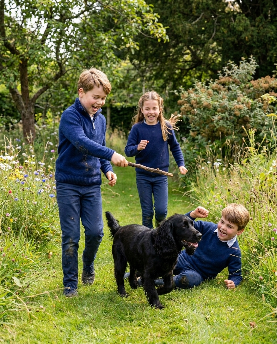 The palace gardens, renowned for their splendor and beauty, have become a vibrant playground since Peter’s arrival. Reports indicate that Prince George, Princess Charlotte, and Prince Louis are often seen laughing and playing with Peter, the dog described as friendly and influential. Whether they’re playing catch or enjoying a leisurely stroll, the bond between the children and their new dog is evident. Images of Prince Louis giggling as he chases Peter around the meticulously manicured lawns are proof of the joy pets can bring to our lives.