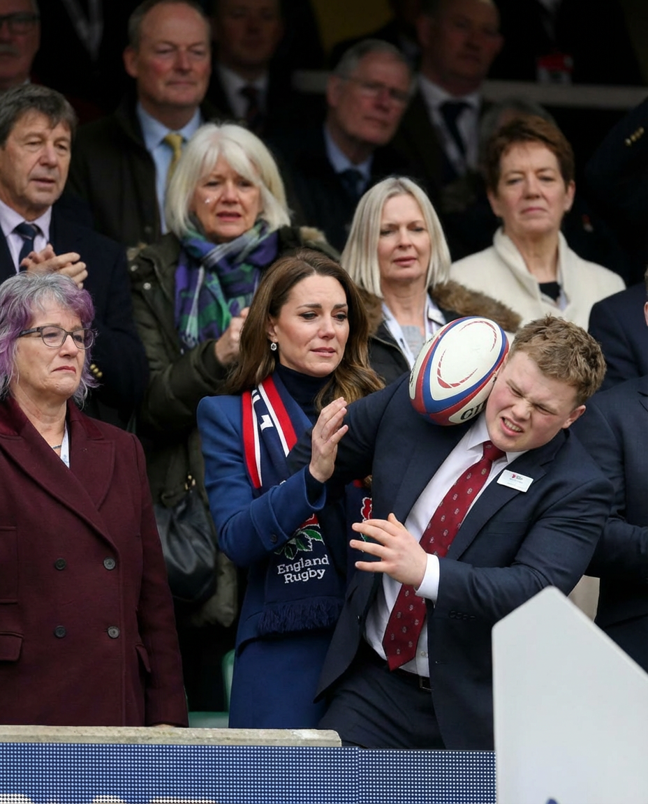As the match progressed, an unexpected incident occurred, shifting attention from the field to the stands. In a particularly tense moment, a ball was kicked into the crowd, and in a split second, a young man sitting next to Princess Catherine made an incredible decision. Without hesitation, he used his body to shield the ball, taking the direct impact to protect the Princess and those around her. The pain he endured was evident, but his protective instinct was even more profound.