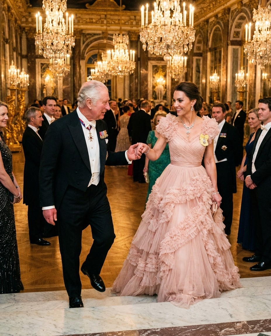 In a world captivated by royal appearances and the elegance of the British monarchy, a recent event involving Catherine, Princess of Wales, has taken social media by storm. At a lavish ceremony, she appeared in a stunning pale pink gown that accentuated her graceful figure. However, it was a fleeting, unscripted moment with King Charles III that truly captured the hearts of onlookers. As she prepared to descend the stairs, the King stepped forward, extending his hand in a warm and respectful gesture. This touching interaction between father-in-law and daughter-in-law not only showcased their close relationship but resonated deeply with the public worldwide.
