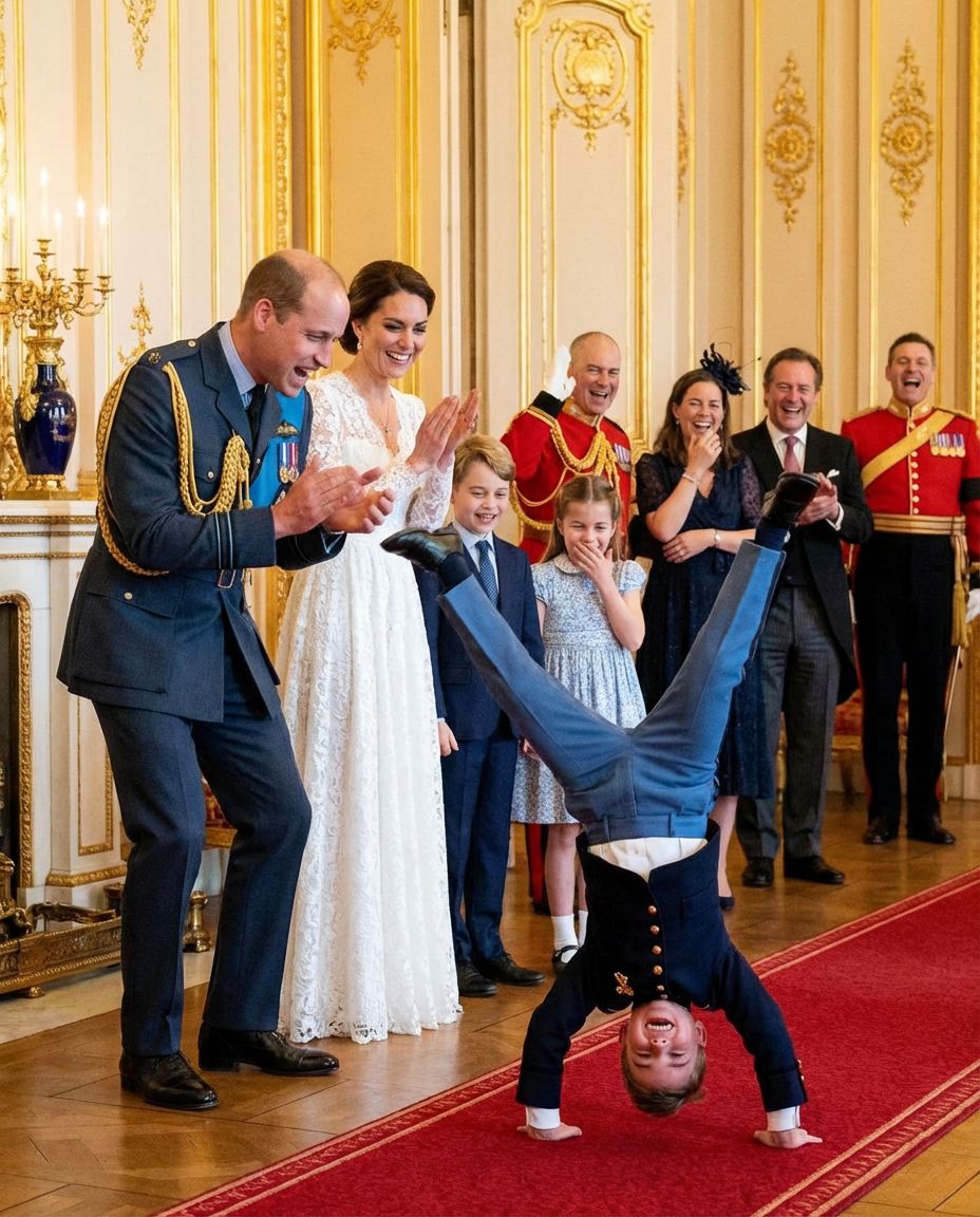 In a world often dominated by formality and tradition, the British royal family has a unique way of reminding us of the joys and innocence of childhood. Recently, an event in a solemn ballroom transformed into an unforgettable spectacle when Louis, the mischievous youngest son of the Duke and Duchess of Cambridge, unexpectedly performed a handstand. This delightful moment not only captured the hearts of those present but also revealed a more playful side of royal life. Let’s explore this adorable scene and discover its significance within the context of family, joy, and royal imagery.