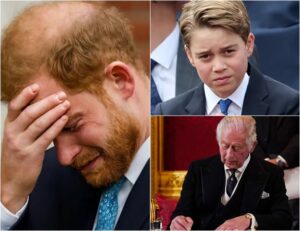 Senior members of the family stood gathered in a private chamber. Prince George, imagined here as old enough to sense the gravity of the moment, struggled to remain composed. His hands trembled. His breath came shallow. Nearby, Prince Harry lowered his head, burying his face in his hands as emotion finally broke through years of guarded resolve.